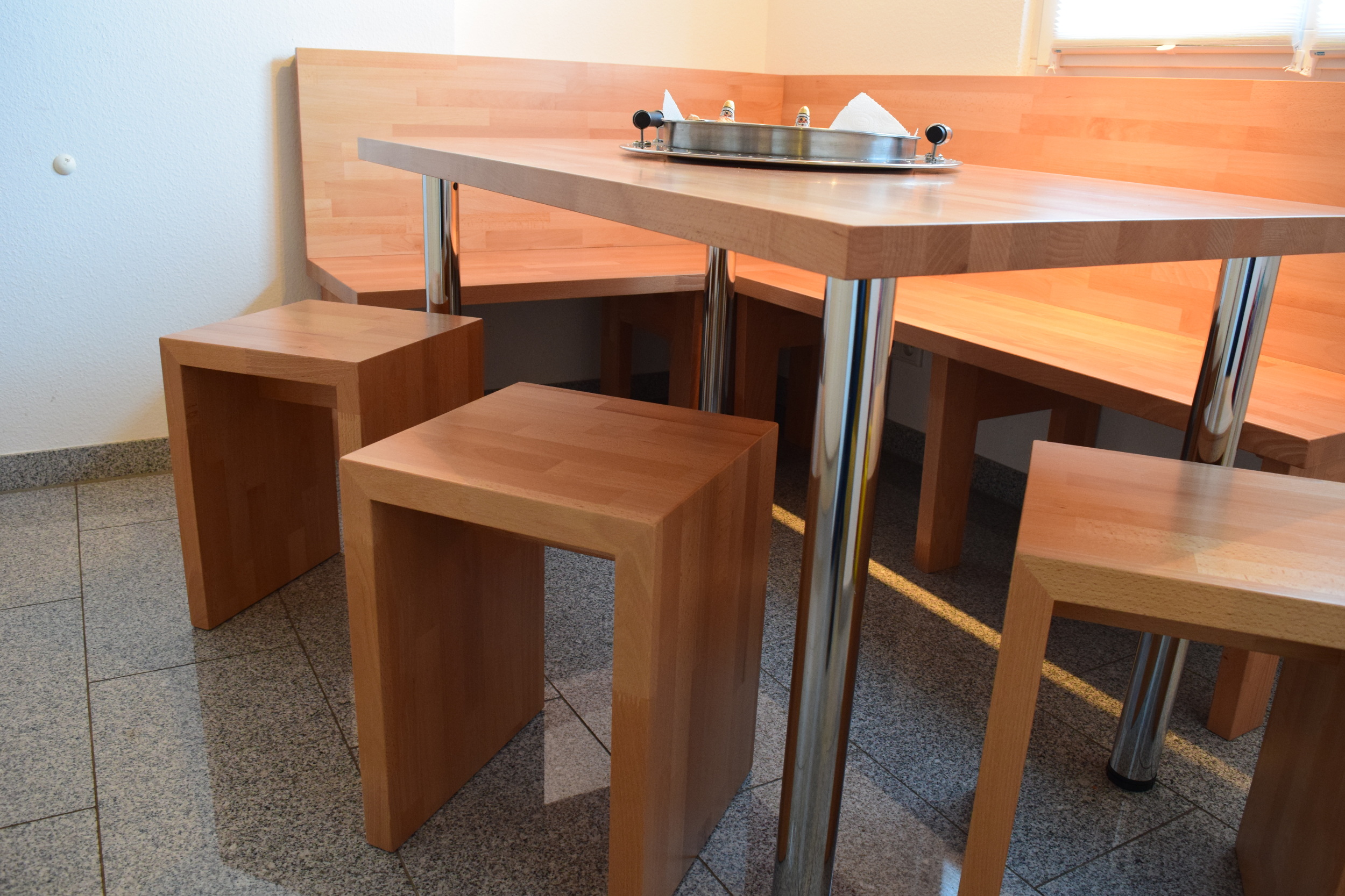 Essgruppe aus Buche Massivholz und verchromten Tischfüßen.